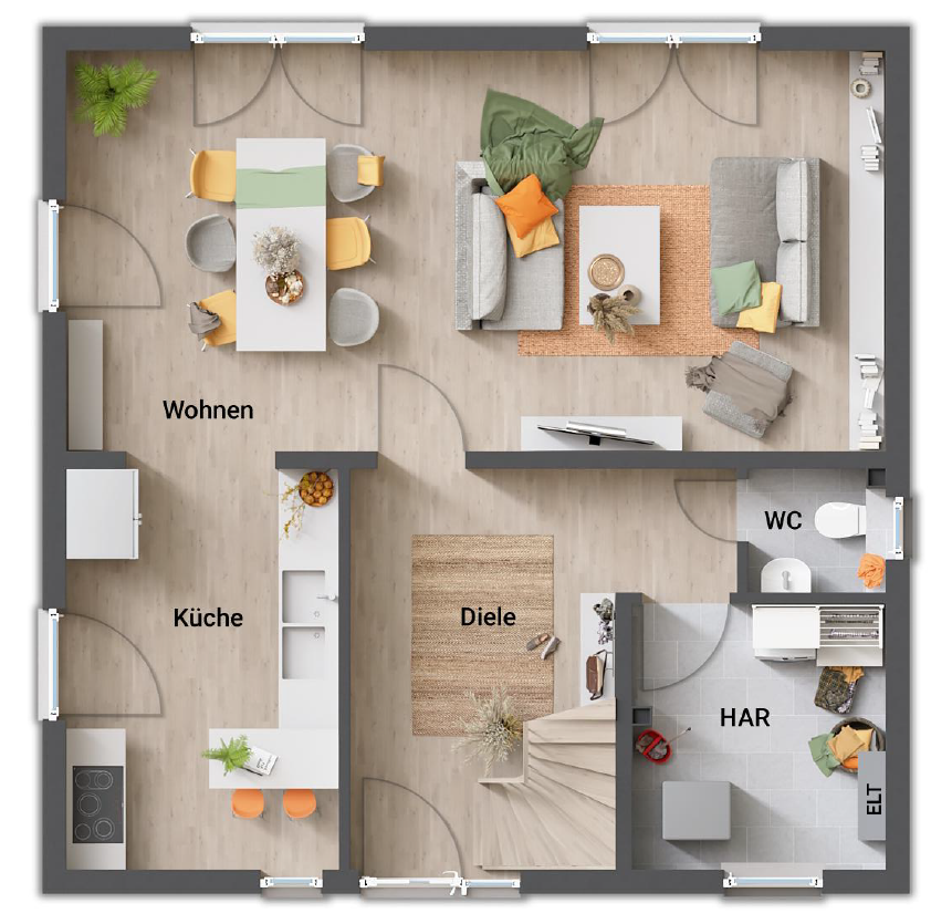 Herzstück des Hauses ist der offene Wohn- und Essbereich mit integrierter Küche, der ein einladendes Ambiente für gemeinsames Wohnen und Leben schafft. Insgesamt stehen drei flexibel nutzbare Zimmer zur Verfügung, die sich ideal als Schlafzimmer, Arbeitszimmer oder Ankleide gestalten lassen und somit individuell an Ihre Bedürfnisse angepasst werden können. Dieses Einfamilienhaus eignet sich perfekt für Paare oder kleine Familien, die modernes Wohnen in angenehmer Umgebung schätzen.